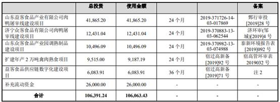 益客食品本次上市拟募集资金106,063.43万元,其中41,865.20万元用于山东益客食品产业有限公司肉鸭屠宰线建设项目,12,431.04万元用于济宁众客食品有限公司肉鸭屠宰线建设项目,10,496.09万元用于山东众客食品产业园调熟制品建设项目,9187.19万元用于扩建年产2万吨禽肉熟食项目,6083.91万元用于益客食品供应链数字化建设项目,26,000.00万元用于补充流动资金。