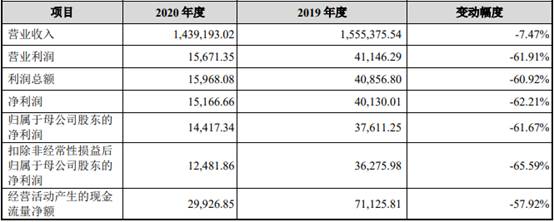 根据2020年经审阅的财务数据,益客食品的营业收入由2019年的155.54亿元下降至2020年的143.92亿元,降幅为7.47%,公司归属于母公司股东的净利润由2019年的3.76亿元下降至2020年的1.44亿元,降幅为61.67%,扣除非经常性损益后归属于母公司股东的净利润由2019年的3.63亿元下降至2020年的1.25亿元,降幅为65.59%。