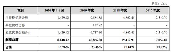 另外,2017年至2020年上半年,益客食品的税收优惠金额分别为2510.70万元、4862.45万元、9717.60万元和1429.12万元,占当期利润总额的比例分别为27.72%、25.04%、23.46%和17.76%。