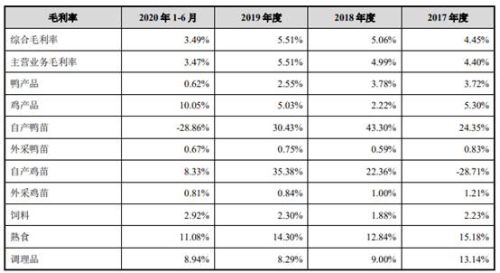 2017年至2020年上半年,益客食品的综合毛利率分别为4.45%、5.06%、5.51%和3.49%,但放在行业中来对比,益客食品的毛利率只有竞争对手的一半。同行业可比公司新希望毛利率分别为8.15%、8.73%、12.07%和13.01%,华英农业毛利率分别为11.21%、11.08%、7.71%和-13.93%。