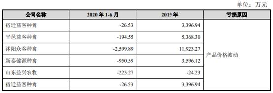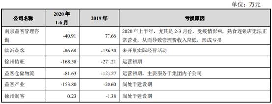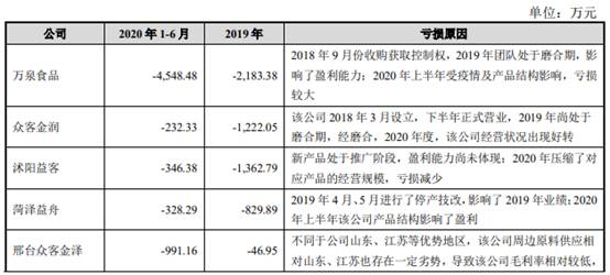 益客食品的子公司万泉食品亏损最多,2019年、2020年上半年公司亏损2183.38万元和4548.48万元。