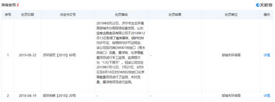 如公司控股的山东益客金鹏食品有限公司,2018年4月遭曾到邹平市环保局处罚,决定文书号为“邹环拘移[2018]20号”。2019年8月,济宁市生态环境局邹城市分局发现山东益客金鹏食品有限公司于2018年12月13日取得了禽类屠宰、锅炉的排污许可证,公司应对其DW001排放口(雨水排放口)流量、悬浮物、化学需氧量项目进行手工监测,监测频次为“1次/下雨天”。但该公司仅在2019年7月12日、7月27日、8月9日及8月10日对DW002排放口化学需氧量项目进行了监测,未对流量、悬浮物项目进行监测。
