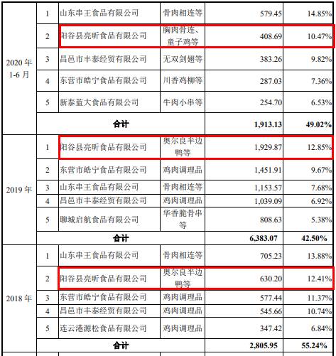 2018年至2020年上半年,益客食品向亮昕食品的采购金额分别为630.20万元、1929.87万元、408.69万元,占同类采购的比例分别为12.41%、12.85%、10.47%。