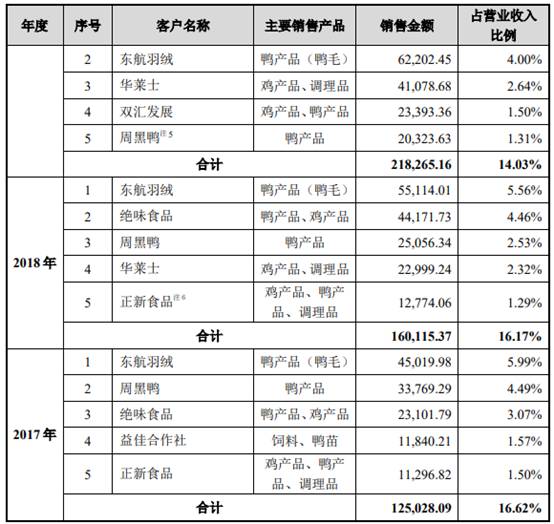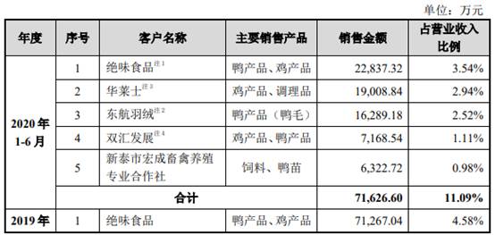 据招股说明书显示,益客食品主要向东航羽绒销售鸭产品(鸭毛),2017年至2020年上半年,销售金额分别为45,019.98万元、55,114.01万元、62,202.45万元和16,289.18万元,占营收比例5.99%、5.56%、4.00%和2.52%。可以看出,益客食品对东航羽绒的销售金额是越来越高的。