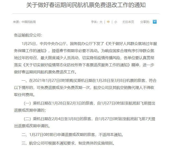 民航局:春节期间可免费退改票