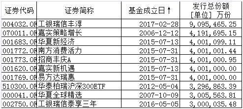 发行规模最大的前十只基金均超过300亿的首募规模,2017年发行的工银瑞信丰淳以909.55亿份牢牢占据榜首,虽然未能坚持到年底,但在历史上依旧留下了浓烈的一笔,嘉实、华夏等在2015年成立的5只国家队基金也名列前茅。